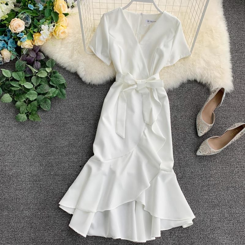 Elegante vestido de uma só cor com mangas curtas.