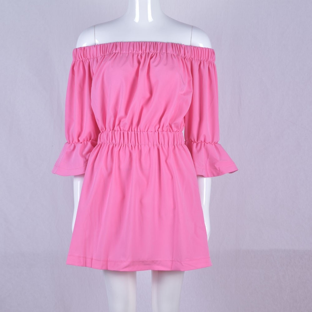 Vestido de verão confortável com ombros à mostra e saia com pregas.