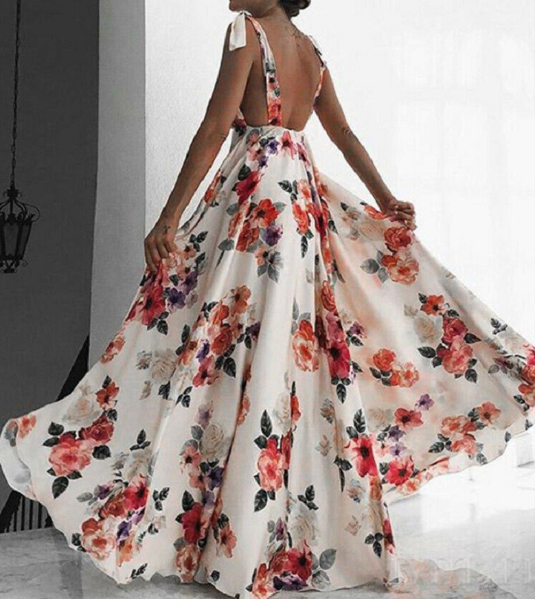 Vestido maxi de verão de luxo para senhora com padrão floral.