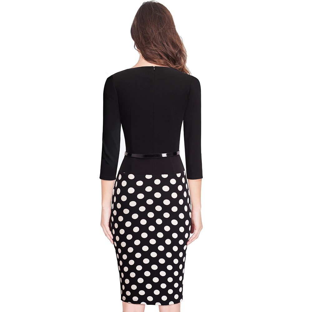 Elegante vestido casual feminino até ao joelho em clássico preto e branco.