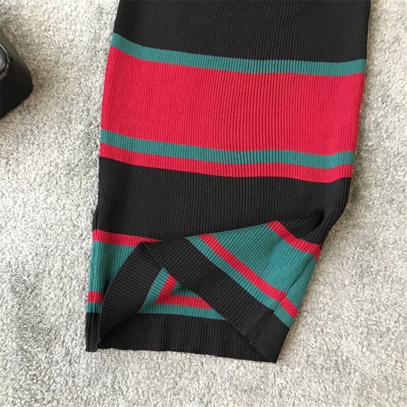 Vestido justo em malha com alças e um padrão riscado marcante.