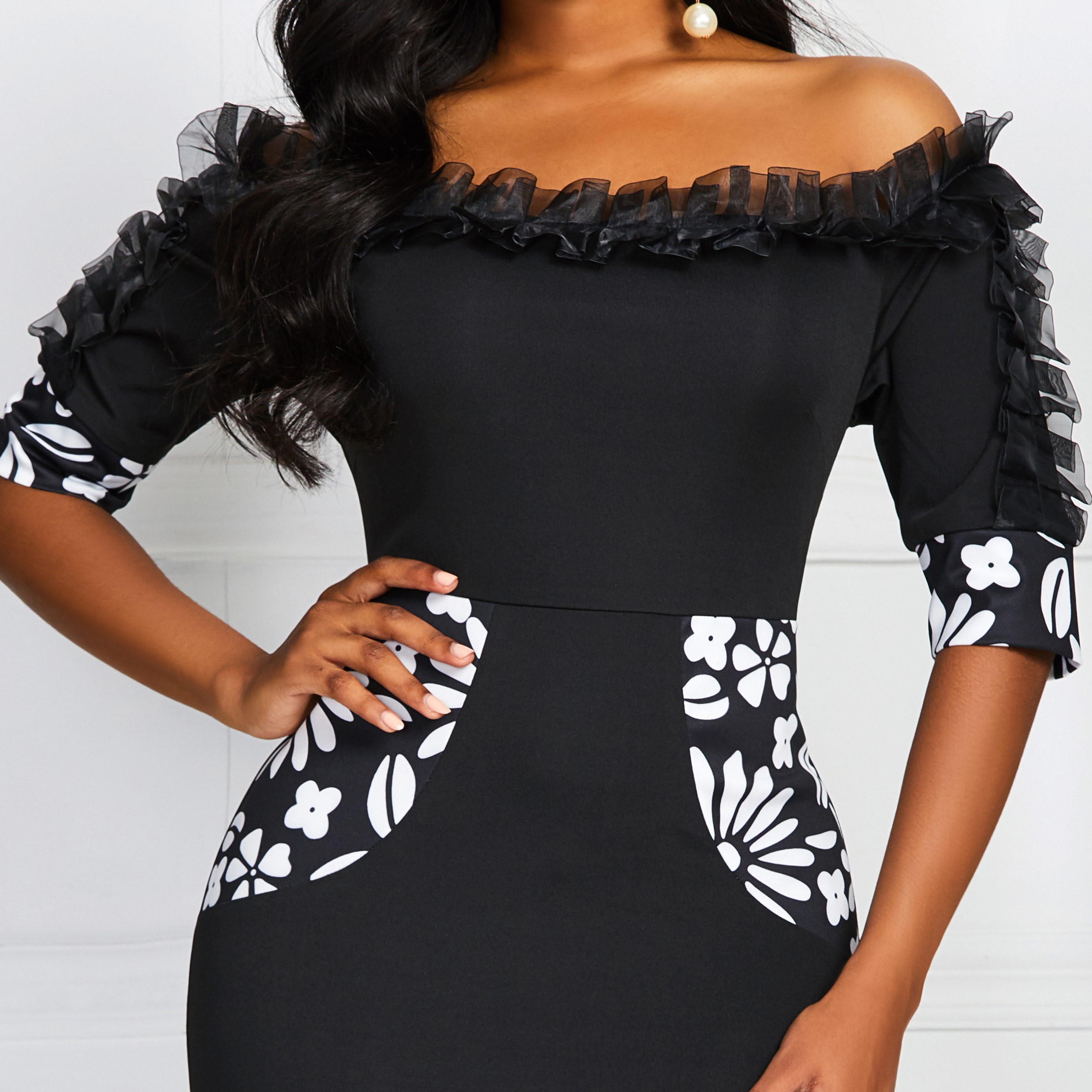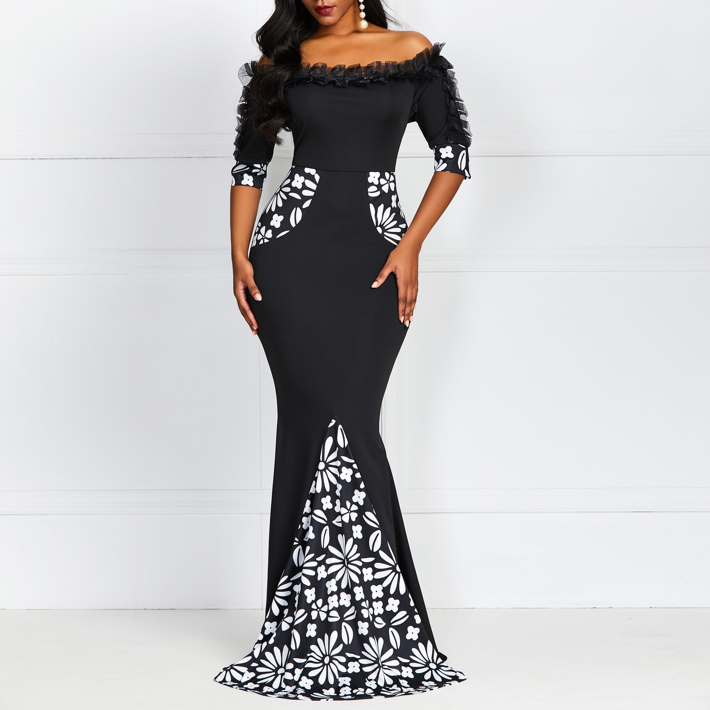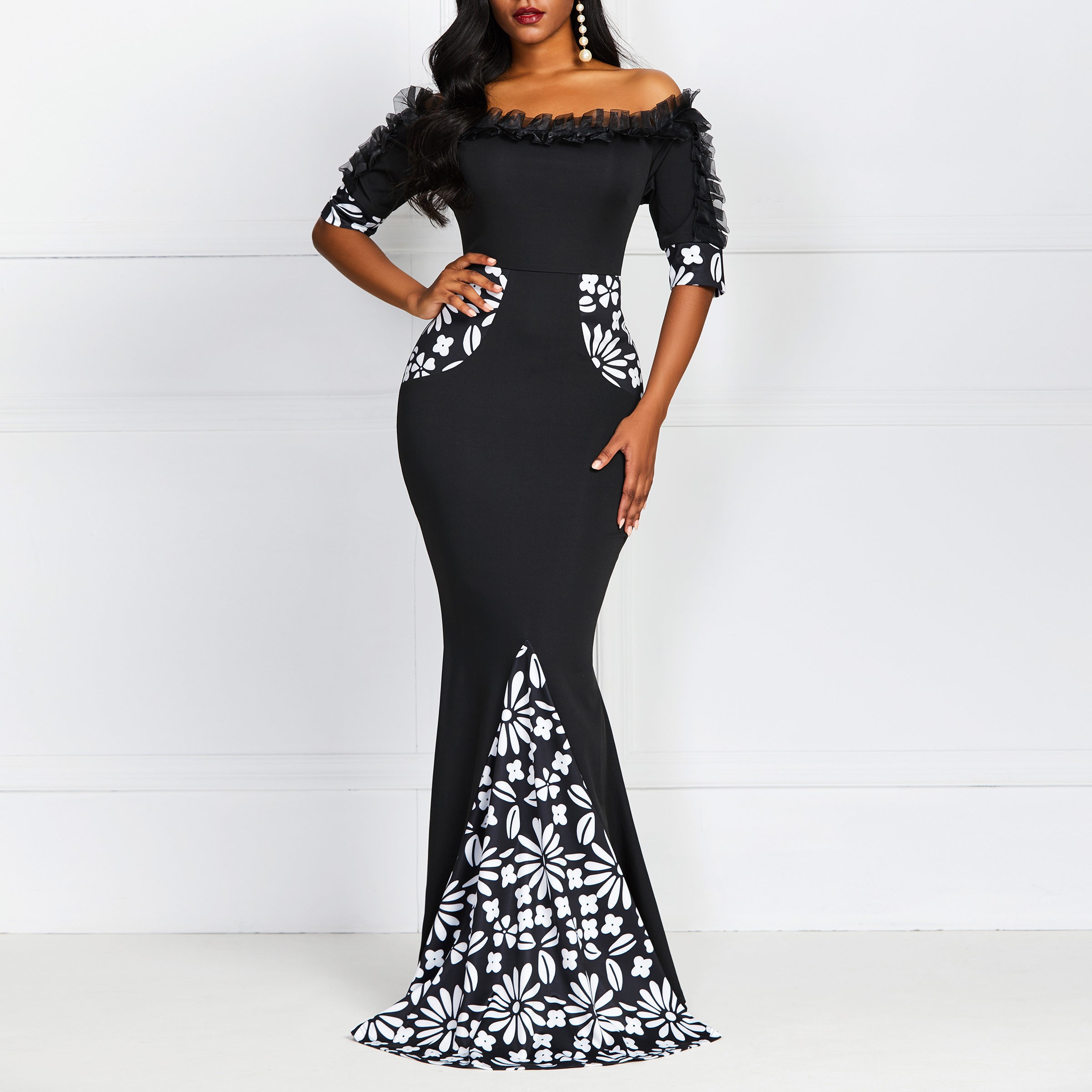 Vestido preto elegante com ombros caídos, longo até ao chão.