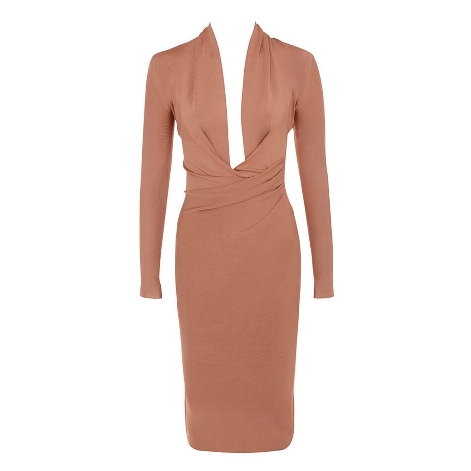Vestido midi feminino em tecido elástico com mangas longas.