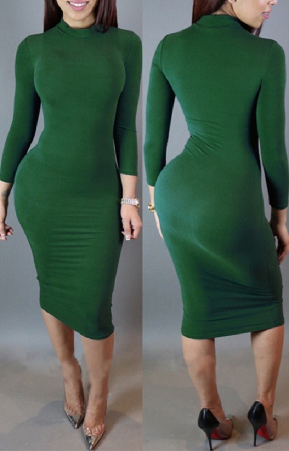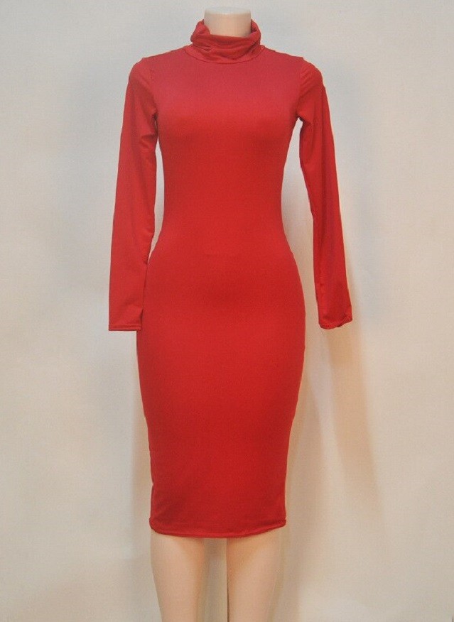 Vestido midi feminino em tecido elástico com gola alta e mangas longas.