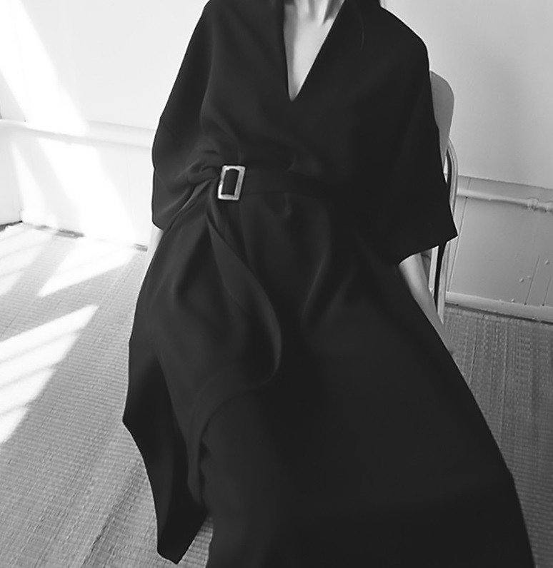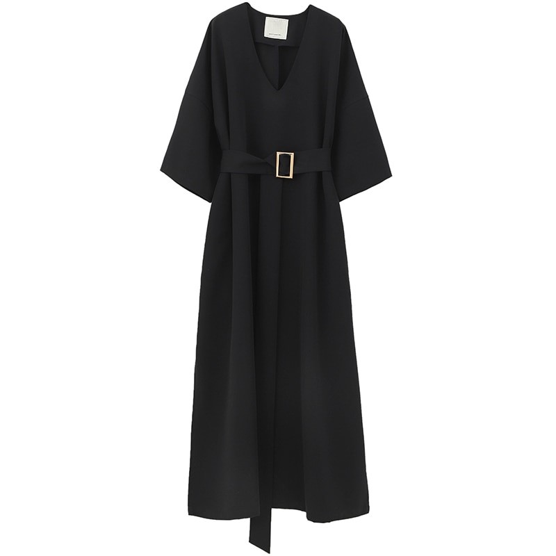 Elegante vestido midi preto com cinto.