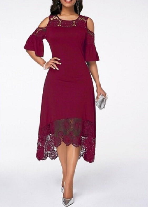Vestido elegante para senhora, abaixo do joelho, decorado com rendas.