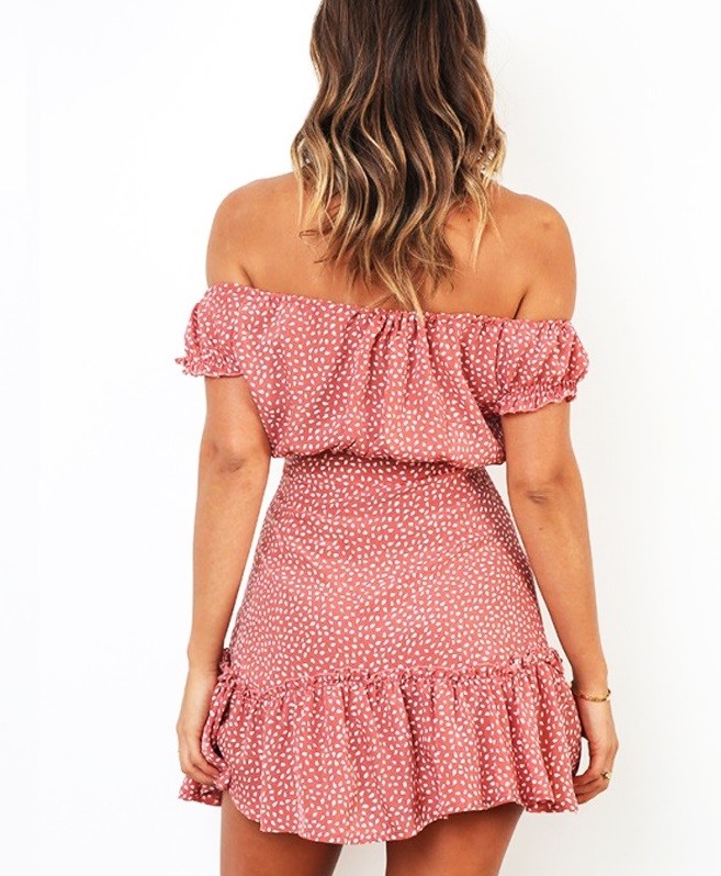 Romântico vestido mini de verão com volantes e ombros caídos.