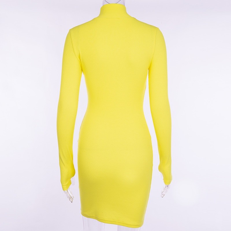 Confortável vestido mini de outono em tecido elástico com gola alta e mangas longas.