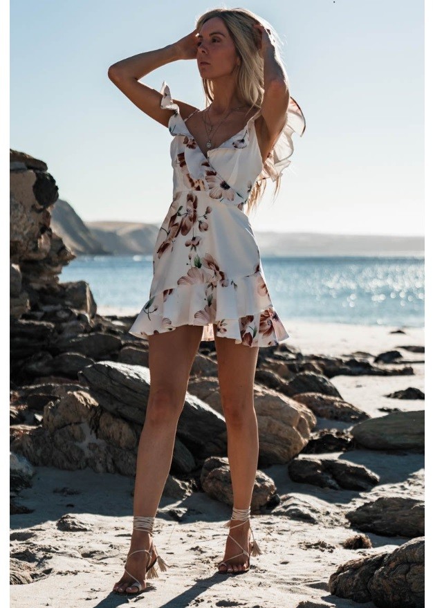 Vestido curto de verão com alças de espaguete e volantes decorativos.