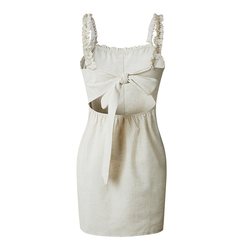 Vestido feminino com alças finas. A bainha e as alças são adornadas com volantes.