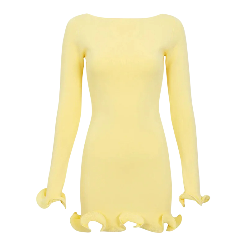 Vestido mini justo e elegante com bainha ondulada nas mangas e na saia. Material elástico que realça a silhueta e capta a atenção em cada detalhe. Descrição completa