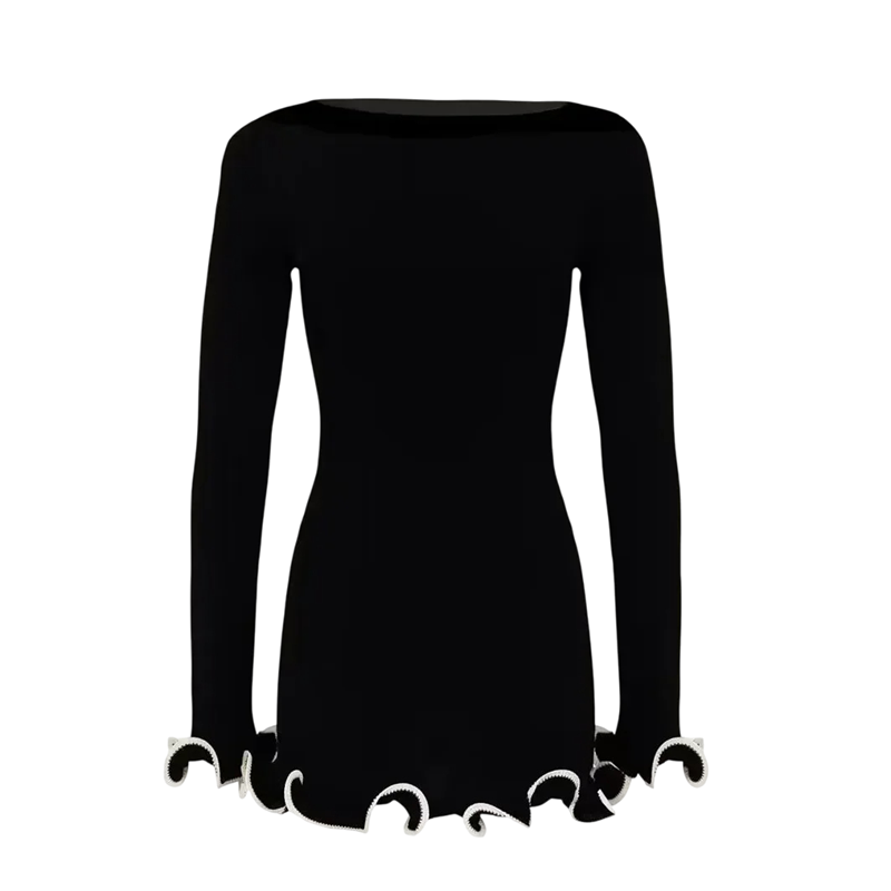 Vestido mini justo de manga longa com decoração ondulada que traz uma combinação única de elegância feminina e estilo moderno. Graças ao corte liso sem decote, é adequado para qualquer ocasião, seja uma festa, um encontro ou eventos sociais. O design sem alças proporciona um visual limpo e sofisticado, enquanto a bainha ondulada nas mangas e na parte inferior confere um toque lúdico ao vestido.
