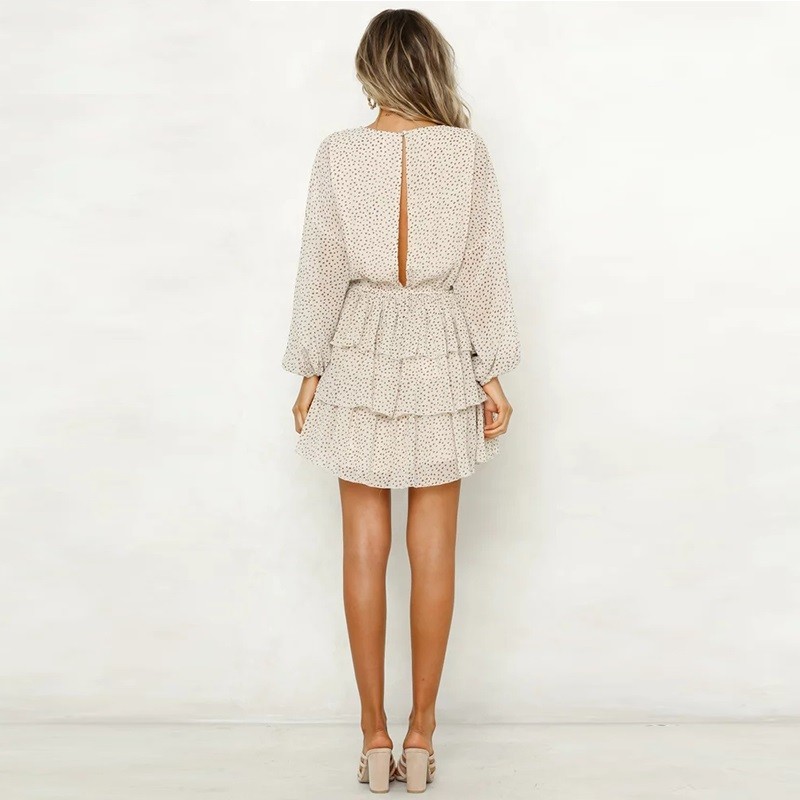 Mangas longas e saia em camadas que parece saída de um conto de fadas.