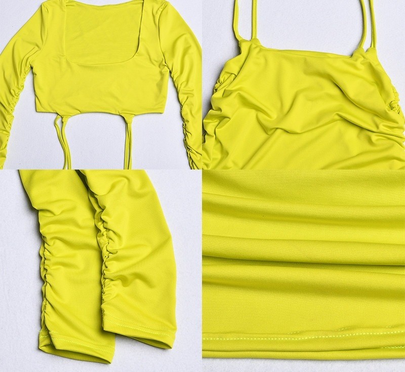 Vestido feminino em comprimento mini. Top franzido e saia com cordão.