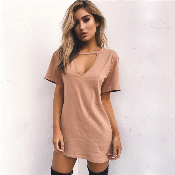 Vestido feminino unicolor com decote estilizado.