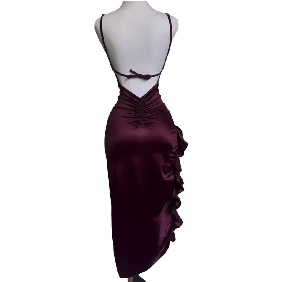 Vestidos de noite justos em cetim brilhante com fenda profunda, babados e decote franzido. A escolha ideal para bailes, galas e festas. Descrição completa