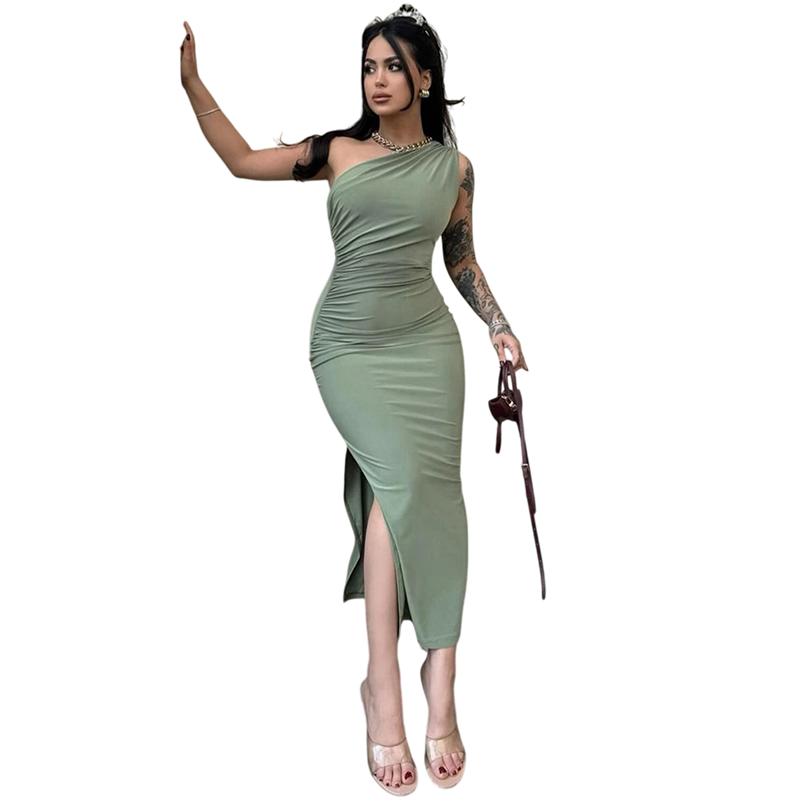 Vestidos maxi elegantes longos com alça assimétrica corte justo drapeado na cintura fenda alta comprimento abaixo do joelho vestidos de festa