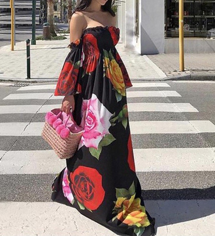 Bonitos vestidos maxi de verão com um padrão floral marcante e ombros caídos.