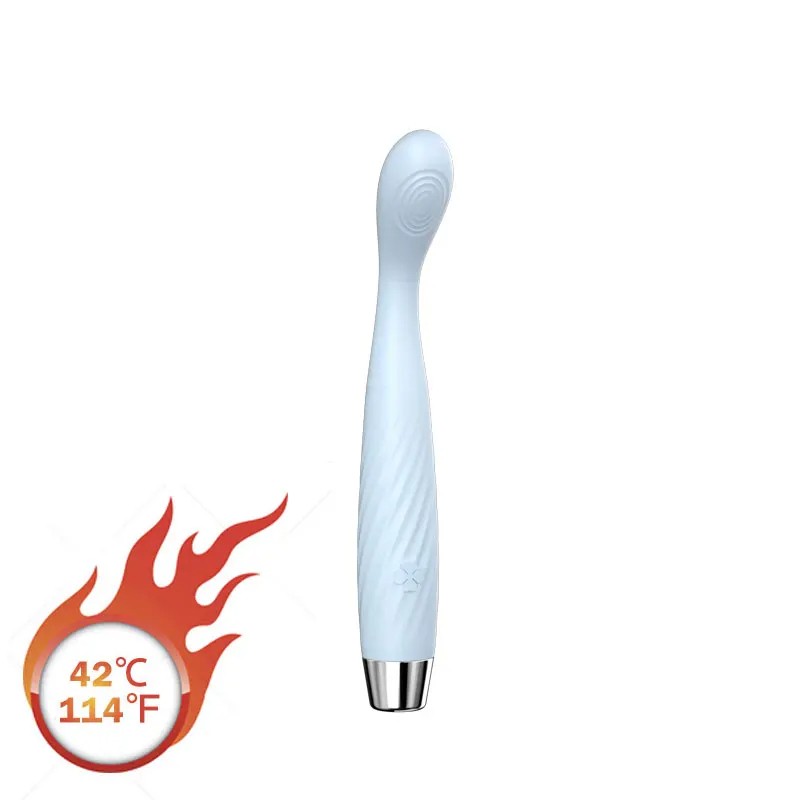 Vibrador compacto com cabeça curva, 7 modos de vibração e aquecimento até 42 °C. Silicone macio, carregamento USB. Silencioso e discreto. Descrição completa